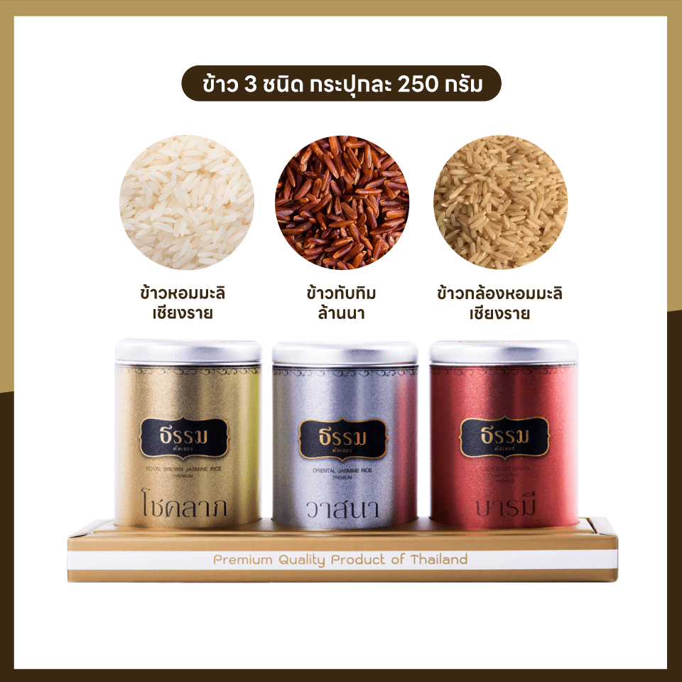 ภายในเป็นข้าวบรรจุสุญญากาศแยกชนิด (1 กระปุก = 1 ชนิด) ชนิดละ 250 กรัม