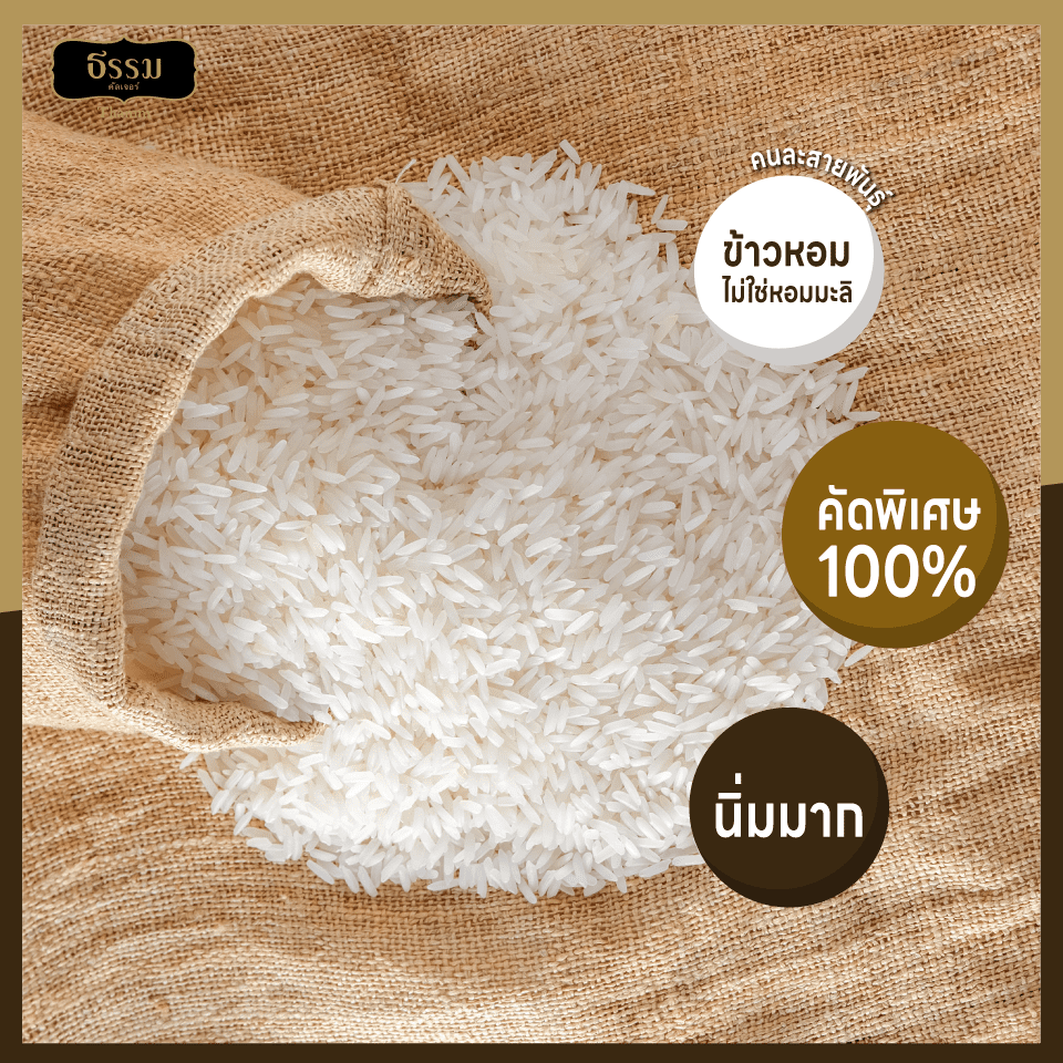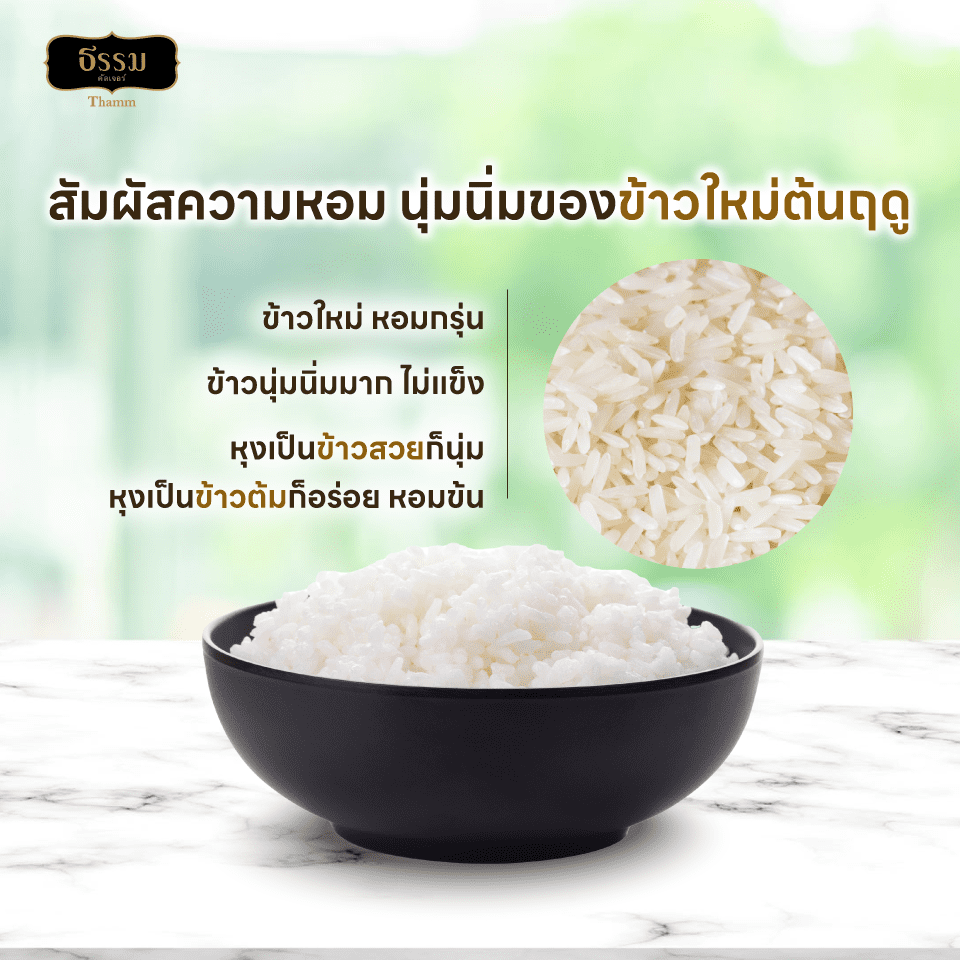 ธรรม ข้าวหอมใหม่ต้นฤดู คุณภาพคัดพิเศษ100% เป็นข้าวหอมใหม่ต้นฤดูที่เก็บเกี่ยวใหม่ (ที่มีอายุข้าวหลังเก็บเกี่ยวไม่เกิน 3 เดือน) คัดสรรจากแหล่งเพาะปลูกคุณภาพเยี่ยมในหลากหลายพื้นที่ เมื่อหุงแล้วมีความหอม นุ่ม อร่อย และมียางข้าว เหมาะสำหรับผู้ที่ชอบทานข้าวนิ่มมากๆ บรรจุในบรรจุภัณฑ์ที่มีซิปล็อคเพื่อถนอมความสดใหม่ ควบคุมคุณภาพการขัดสีระดับมาตรฐานส่งออกต่างประเทศ ได้รับการรับรองคุณภาพและมาตรฐานสากล