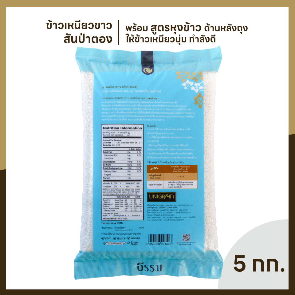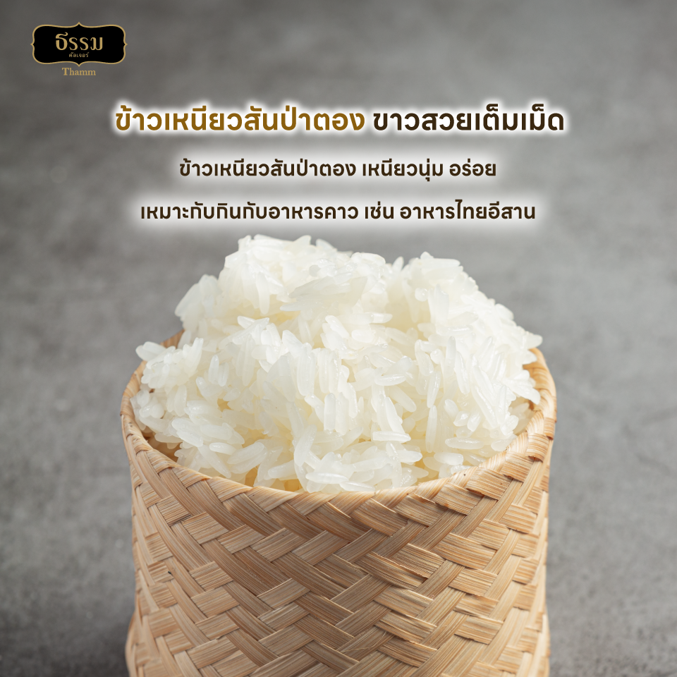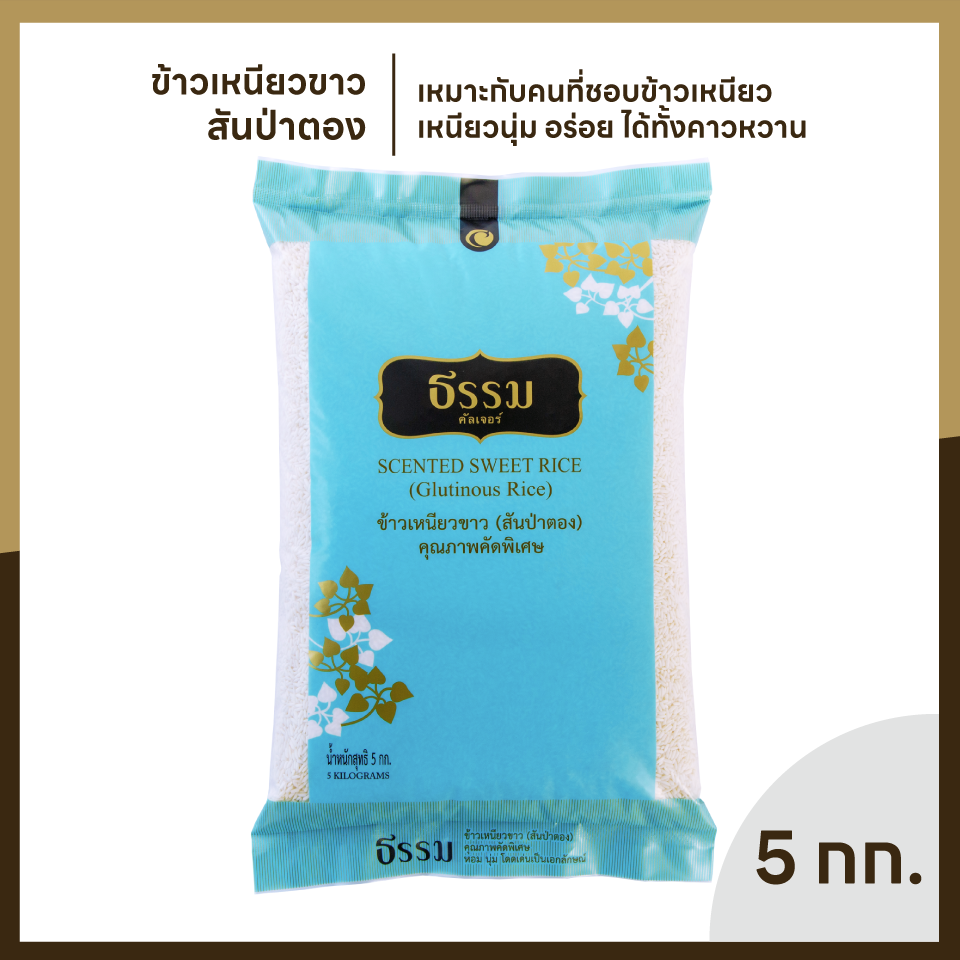 มีชื่อเรียกที่เป็นที่รู้จักในกลุ่มผู้บริโภคว่า “ข้าวเหนียวสันป่าตอง” จากแหล่งเพาะปลูกข้าวเหนียวชั้นดีภาคเหนือตอนบน จังหวัดเชียงราย เชียงใหม่ และพะเยา ซึ่งมีความอุดมสมบูรณ์ของดิน น้ำและอากาศที่เย็น ทำให้ได้เมล็ดข้าวเหนียวที่มีความนุ่มเป็นพิเศษ แตกต่างจากข้าวเหนียวที่ได้จากแหล่งเพาะปลูกอื่นๆ เหมาะสำหรับเมนูอาหารคาวหวานที่มีข้าวเหนียวเป็นส่วนประกอบ ควบคุมคุณภาพการขัดสีระดับมาตรฐานส่งออกต่างประเทศ ได้รับการรับรองคุณภาพและมาตรฐานสากล