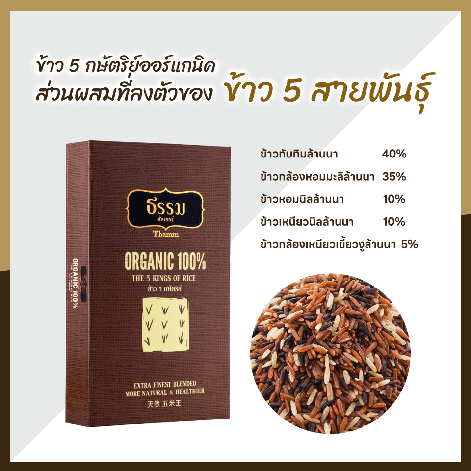 เป็นข้าวออร์แกนิค 5 ชนิด ผสมรวมกัน บรรจุเป็นก้อนข้าวสุญญากาศ ก้อนละ 350 กรัม (1 ชุด มี 2 ก้อน)